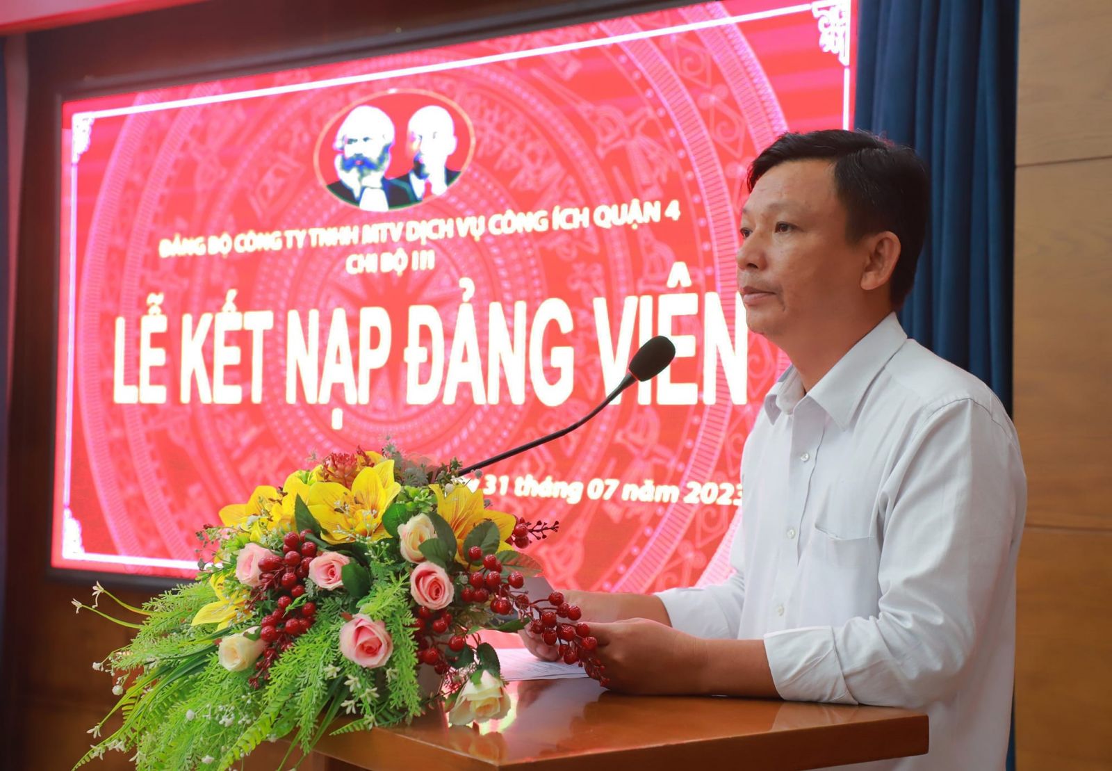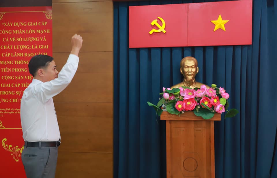 Dưới cờ Tổ quốc và chân dung Chủ tịch Hồ Chí Minh, quần chúng Lê Trung Nam đã tuyên thệ và xin hứa sẽ nỗ lực không ngừng, luôn xứng đáng là người đảng viên gương mẫu, đóng góp sức mình thực hiện thành công nhiệm vụ chính trị của Chi bộ, cũng như Đảng bộ Công ty TNHH MTV Dịch vụ Công ích Quận 4.