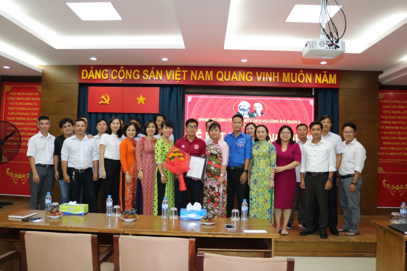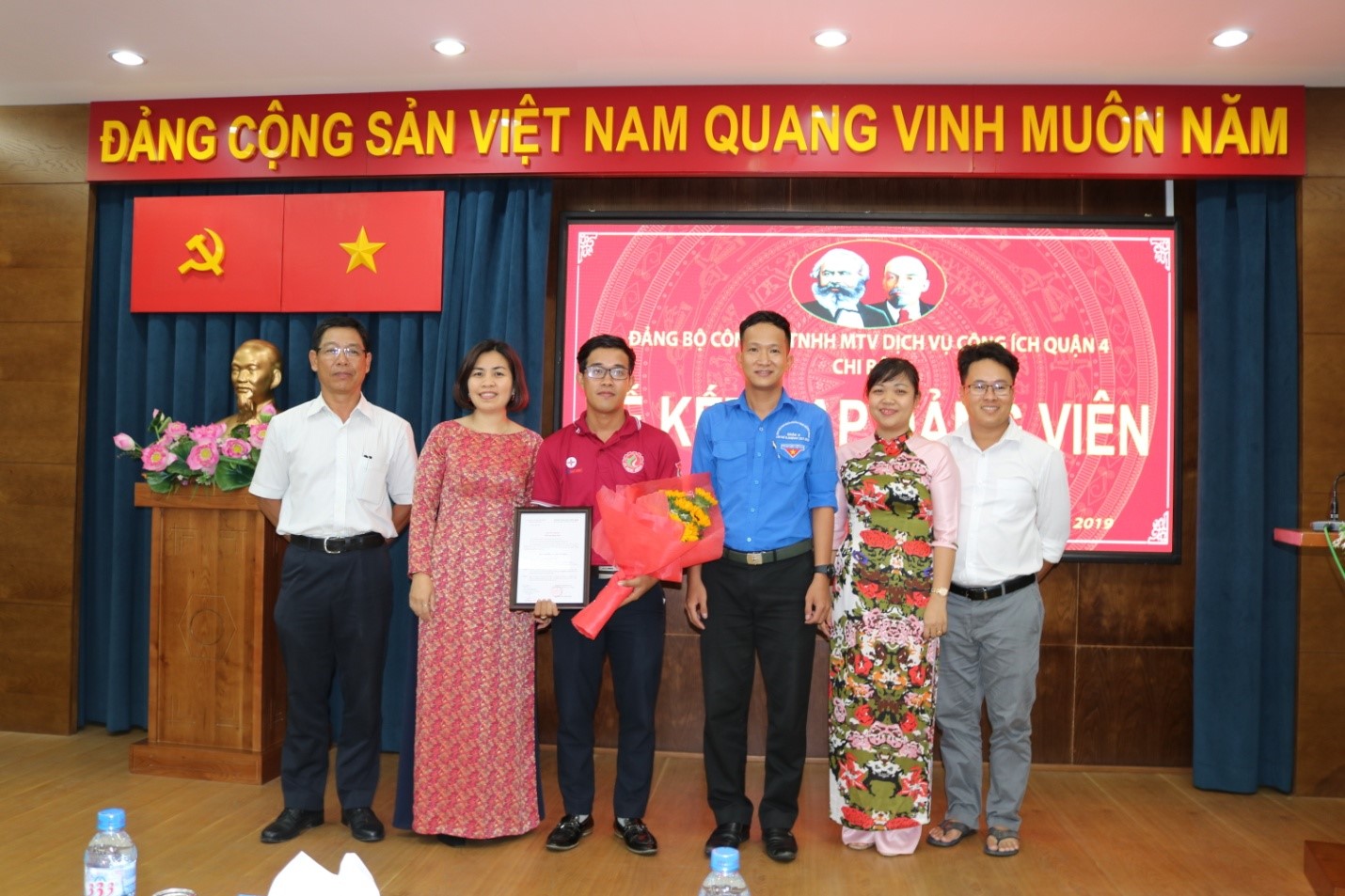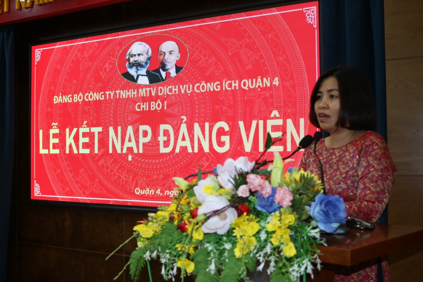 Vào lúc 14 giờ 00, thứ hai, ngày 01 tháng 7 năm 2019 tại Hội trường Công ty TNHH Một thành viên Dịch vụ Công ích Quận 4, được sự nhất trí của Đảng ủy Công ty, Chi bộ 1 tổ chức Lễ kết nạp đảng viên đối với đoàn viên công nhân Nguyễn Trung Tín công tác tại Phòng Dịch vụ Công ích và Môi trường trong không khí trang trọng, đúng trình tự, thủ tục của Điều lệ Đảng. Buổi lễ vinh dự đón tiếp sự hiện diện của đồng chí Trần Mai Chí – Bí thư Quận đoàn 4, đồng chí Lê Thị Ái Thu – Phó Bí thư Đảng ủy Công ty, đồng chí Trần Vân Nam – Phó Giám đốc Công ty và đồng chí Nguyễn Hoàn Tâm – Bí thư Đoàn TNCS Hồ Chí Minh Công ty cùng đại diện Cấp ủy các chi bộ trực thuộc Đảng bộ và toàn thể đảng viên chi bộ 1 về tham dự.