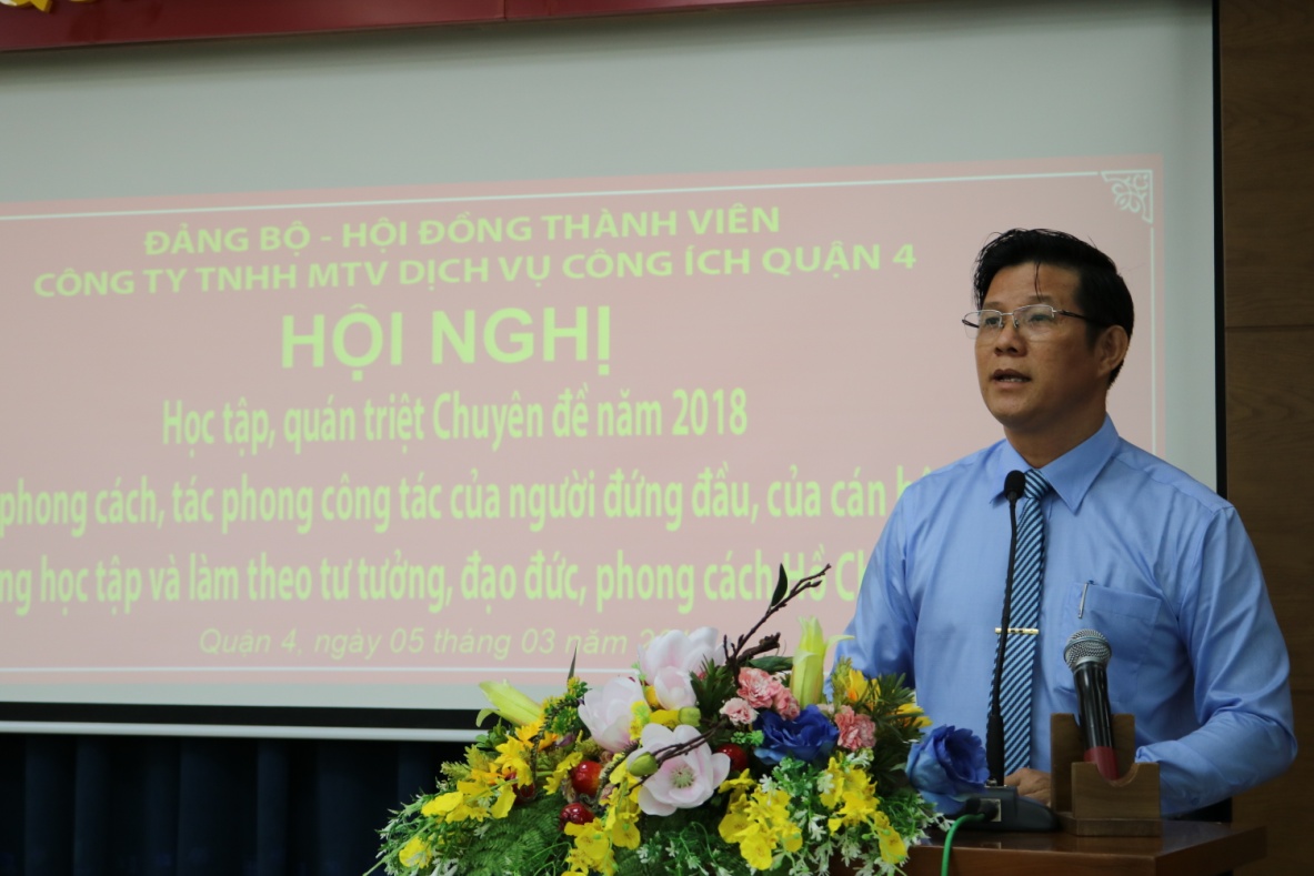 Chủ trì hội nghị đồng thời là Báo cáo viên, đồng chí Võ Thanh Dũng – Quận ủy viên/Bí thư Đảng ủy/Chủ tịch Hội đồng thành viên Công ty quán triệt nhiều nội dung quan trọng, như: Phong cách làm việc dân chủ, quần chúng, khoa học, nêu gương; phong cách lãnh đạo dân chủ, nhưng quyết đoán, sâu sát, khéo dùng người, trọng dụng người tài; xây dựng phong cách lãnh đạo của người đứng đầu theo phong cách Hồ Chí Minh; Giải pháp xây dựng phong cách chỉ đạo, làm việc của người đứng đầu. Đối với từng cá nhân cán bộ, đảng viên, đặc biệt là những người đứng đầu cần học tập, làm theo bằng những hành động, việc làm cụ thể, phù hợp, thiết thực để việc thực hiện Chỉ thị 05-CT/TW được thường xuyên, liên tục, nghiêm túc xây dựng bản cam kết đăng kí rèn luyện về trách nhiệm thực hiện nêu gương của cán bộ đảng viên, nhất là cán bộ chủ chốt, người đứng đầu các cấp gắn với việc thực hiện Chỉ thị 05-CT/TW của Bộ chính trị về “Đẩy mạnh học tập và làm theo tư tưởng, đạo đức, phong cách Hồ Chí Minh” và Nghị quyết hội nghị lần thứ 4 Ban chấp hành Trung ương Đảng khóa XII về tăng cường xây dựng, chỉnh đốn Đảng; ngăn chặn, đẩy lùi sự suy thoái về tư tưởng chính trị, đạo đức, lối sống, những biểu hiện “tự diễn biến”, “tự chuyển hóa” trong nội bộ. Đồng chí cũng lưu ý cần tăng cường công tác kiểm tra giám sát tại đơn vị; kịp thời giới thiệu, tuyên dương các gương đảng viên, cán bộ thực hiện tốt việc xây dựng phong cách lãnh đạo của người đứng đầu theo phong cách Hồ Chí Minh.